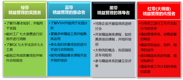 该专业团队,依据能力层次分为四级:精益绿带、精益蓝带、精益黑带及精益红带。各个级别的认定,必须按照《精益生产人员资质评定标准》,通过内部资质评定,获得资质认可,方可授予对应聘书。